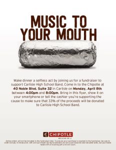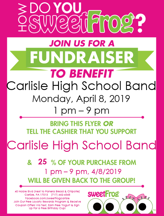 Next week, on Monday, April 8, 2019, the Carlisle High School Band is having our next restaurant fundraiser to help earn money to replace our aging appliances at the Carlisle Fairgrounds concession stand! You can eat at the Carlisle Chipotle from 4 PM to 8 PM or get dessert at the SweetFrog in Carlisle from 1 PM to 9 PM. Bring a Chipotle or SweetFrog flyer to let them know you are supporting the Carlisle High School Band!