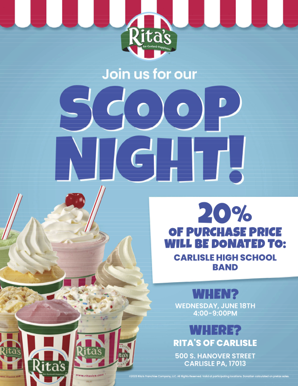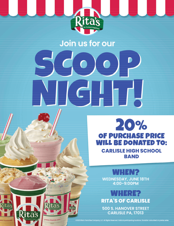 Your next chance to support the band is on Wednesday, June 18th from 4-9 pm, at Rita’s! Be sure to share the flyer with family and friends.