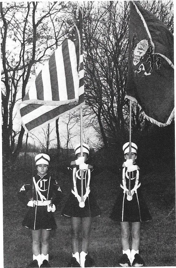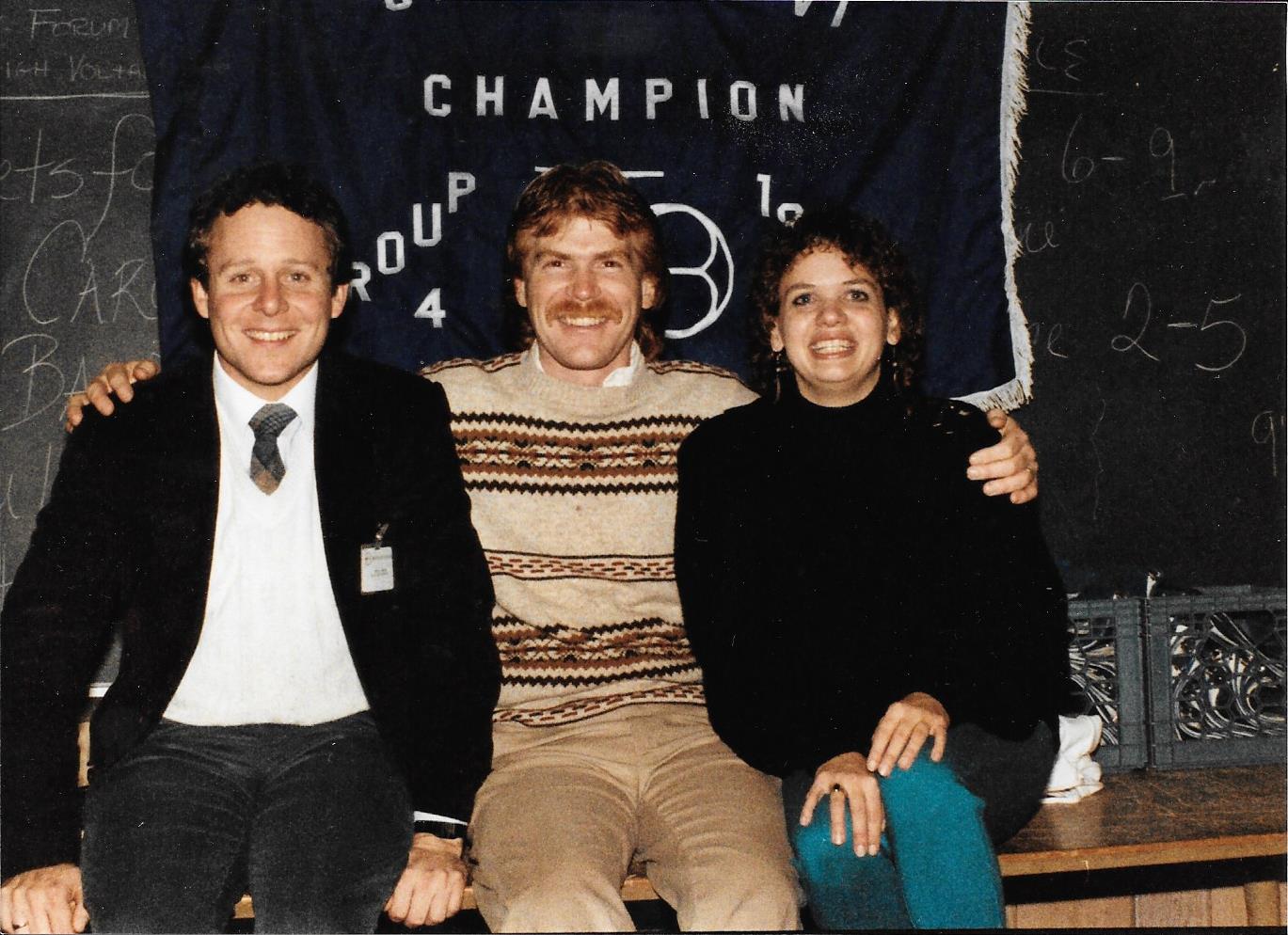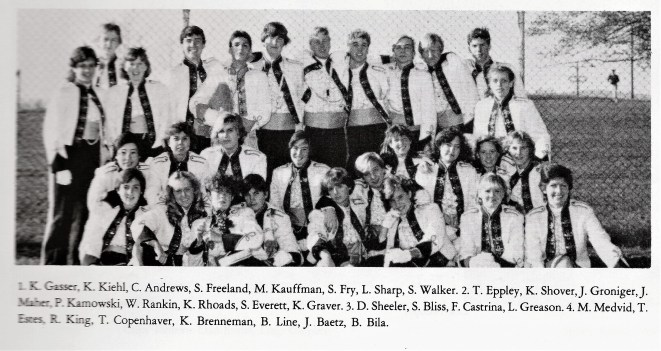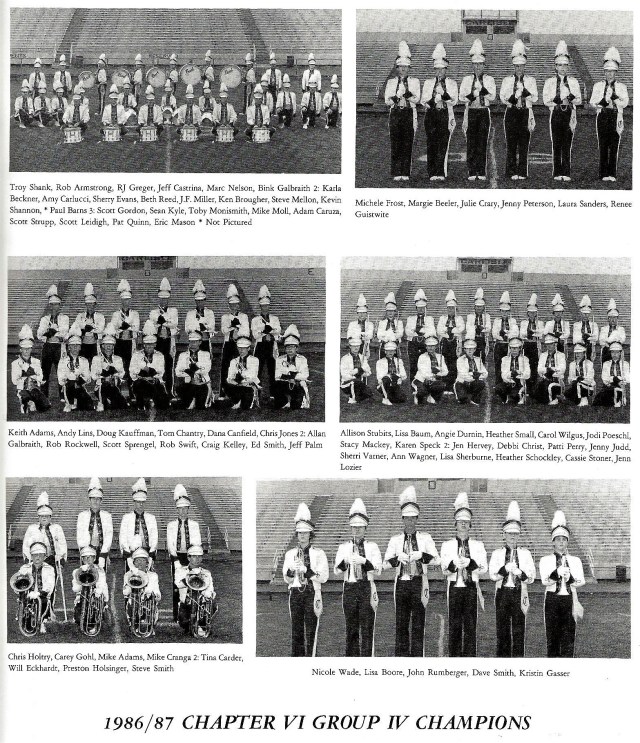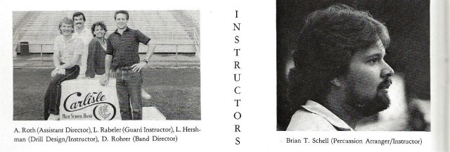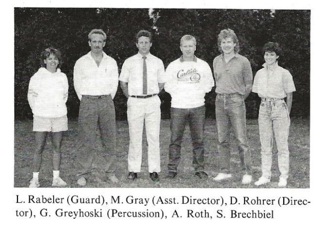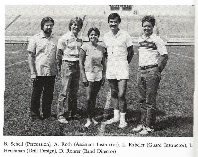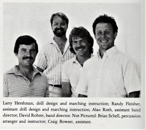 1986 – Band Staff with 1st Championship Banner Left to Right: Dave Rohrer, Allen Roth, Lori Rabeler
