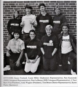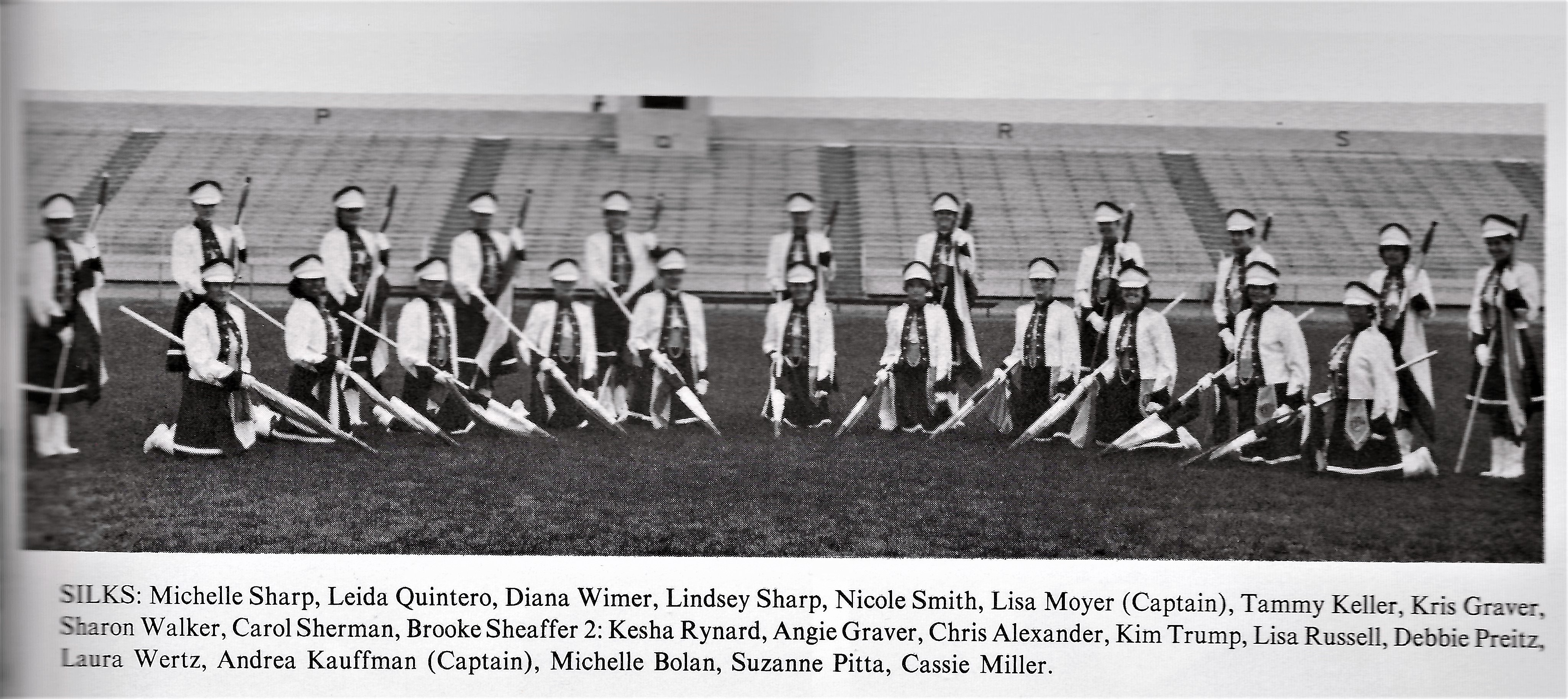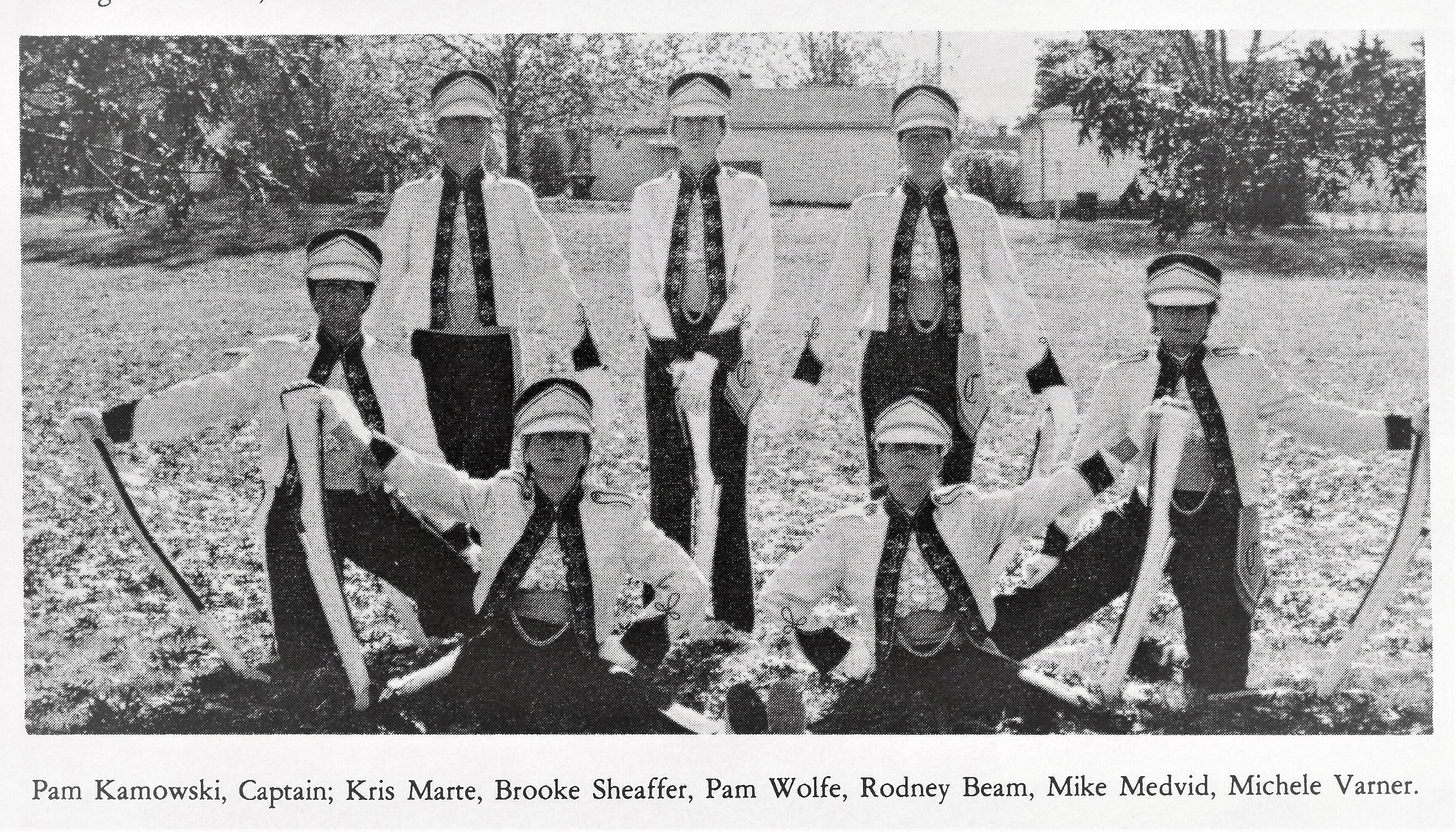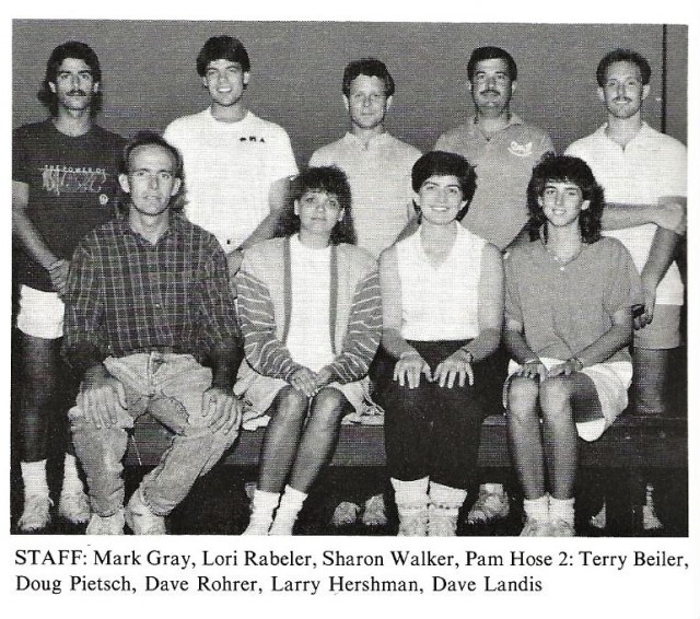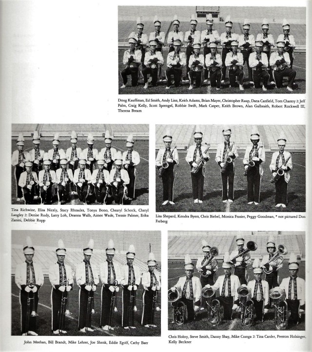 1986 – Band Staff with 1st Championship Banner Left to Right: Dave Rohrer, Allen Roth, Lori Rabeler