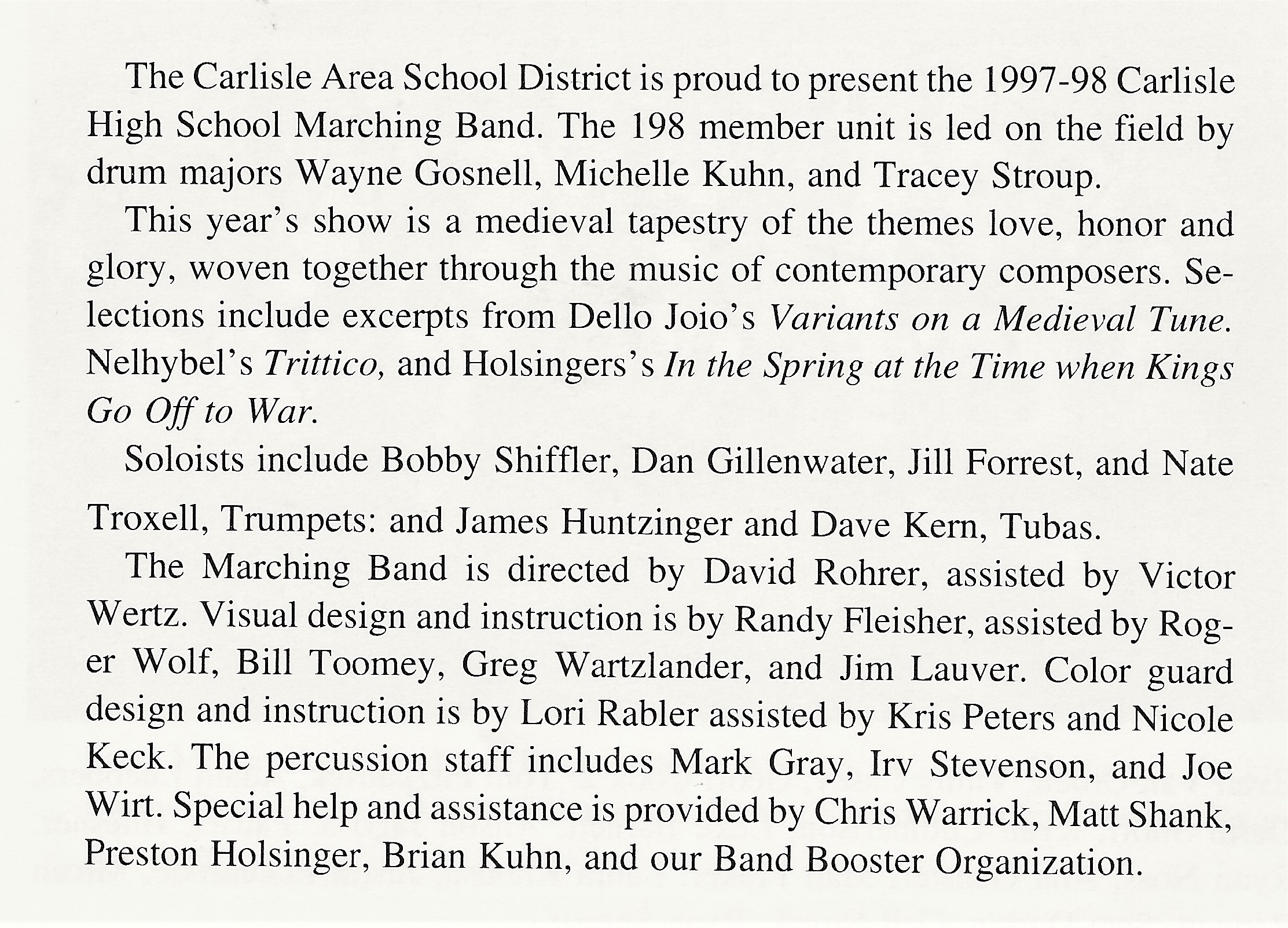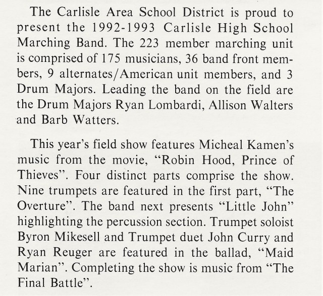 - Marching Band Show – “Michael Kamen’s Robin Hood, Prince of Thieves” – Click here to view the show write-up.